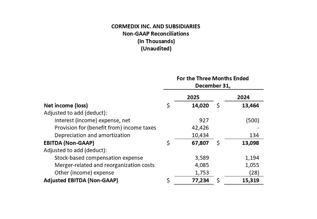 For the fourth quarter of 2025, the Company recorded $14.0 million in net income, or $0.16 per diluted share, compared with net income of $13.5 million, or $0.20 per diluted share, in the fourth quarter of 2024. Net income for the fourth quarter of 2025 included tax expense, primarily associated with the utilization of the Company’s deferred tax assets, of $42.4 million. These deferred tax assets were established in the third quarter of 2025 and are associated with the anticipated future use of CorMedix Net Operating Loss (NOL) carryforwards due to projected future sustained profitability of the Company. Also for the fourth quarter of 2025, CorMedix reported Adjusted EBITDA of $77.2 million, compared to adjusted EBITDA of $15.3 million in the fourth quarter of 2024.