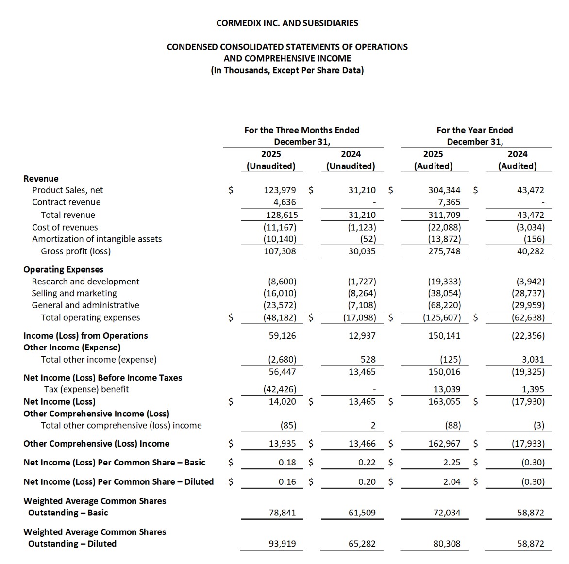 For the year ended December 31, 2025, CorMedix recorded $311.7 million in total revenue, including $258.8 million in net sales of DefenCath and $52.9 million in net revenue from the legacy Melinta portfolio. Pro forma 2025 revenue, which reflects full-year revenue from the Melinta portfolio in addition to full-year net sales of DefenCath, was $401.3 million. The Company reported net income of $163.0 million, or $2.04 per diluted share, compared with a net loss of $17.9 million, or ($0.30) per share, in 2024. Net income was driven primarily by an increase in sales of DefenCath, and, to a lesser extent, net revenue from the acquisition of Melinta, partially offset by higher operating expenses.